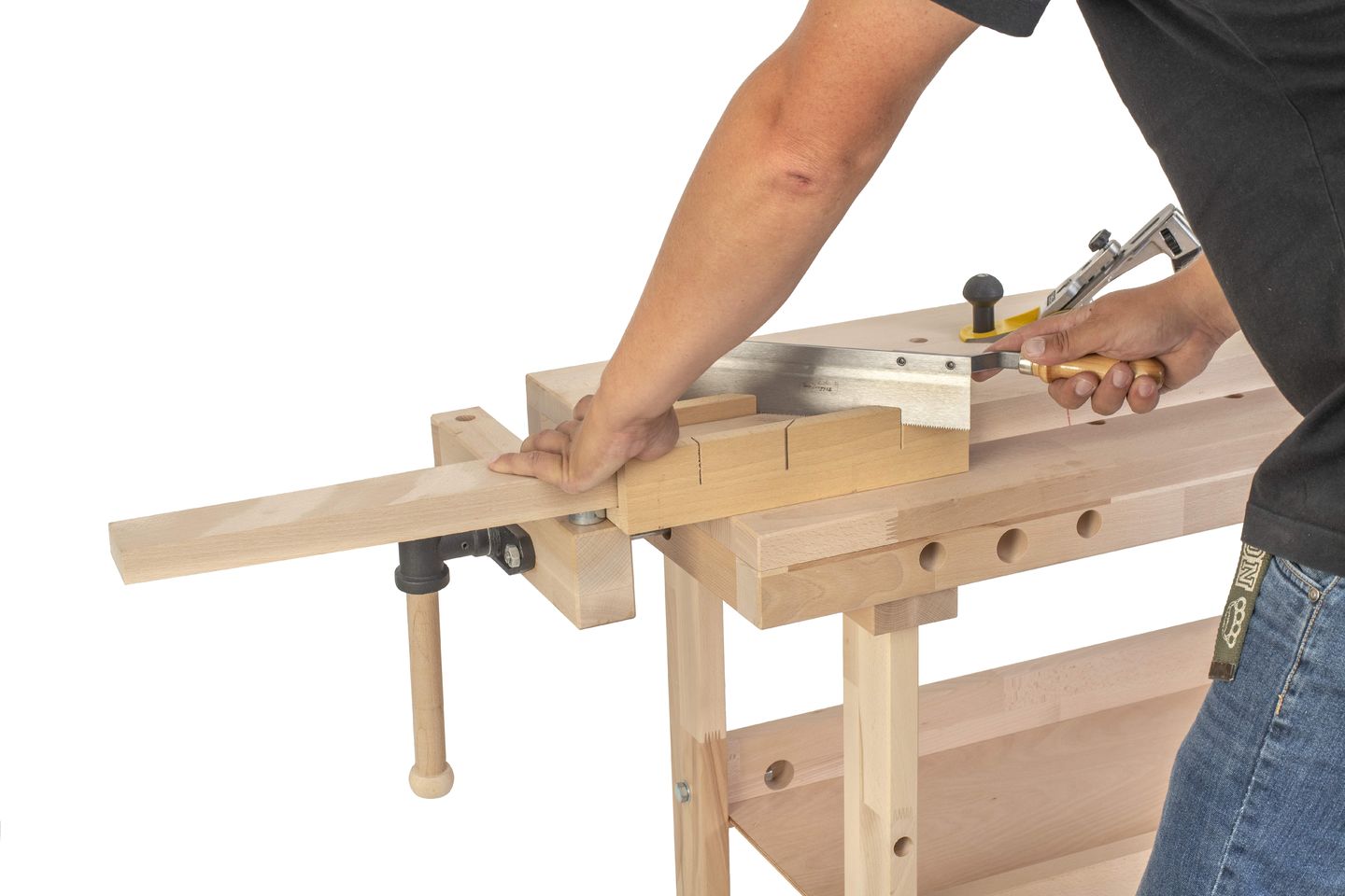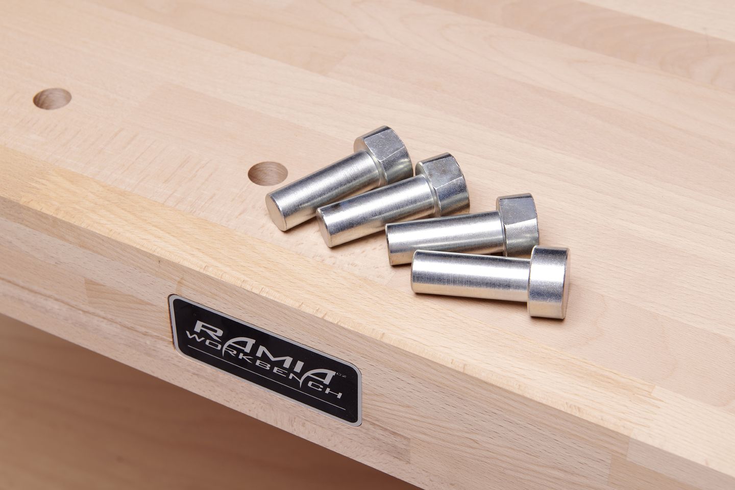 Die Werkbank ist so vorbereitet, dass die Spannzange (Vorderzange) je nach Bedarf für Links- oder Rechtshänder montiert werden kann. Außerdem sind vier runde Bankhaken im Lieferumfang enthalten, die die Vielseitigkeit bei der Arbeit erhöhen.