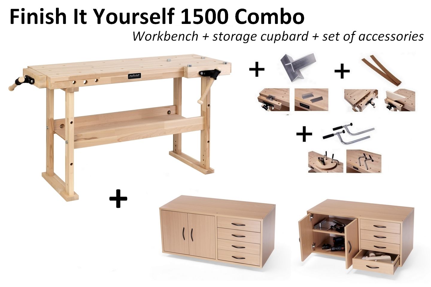 Das Modell Finish It Yourself ist in zwei Größen erhältlich: 1500 mm und 1700 mm. Das Kombi-Paket umfasst zusätzlich den Aufbewahrungsschrank Hobby II sowie ein Set von Hobby-Zubehör, wodurch der Nutzwert jeder Werkbank weiter gesteigert wir